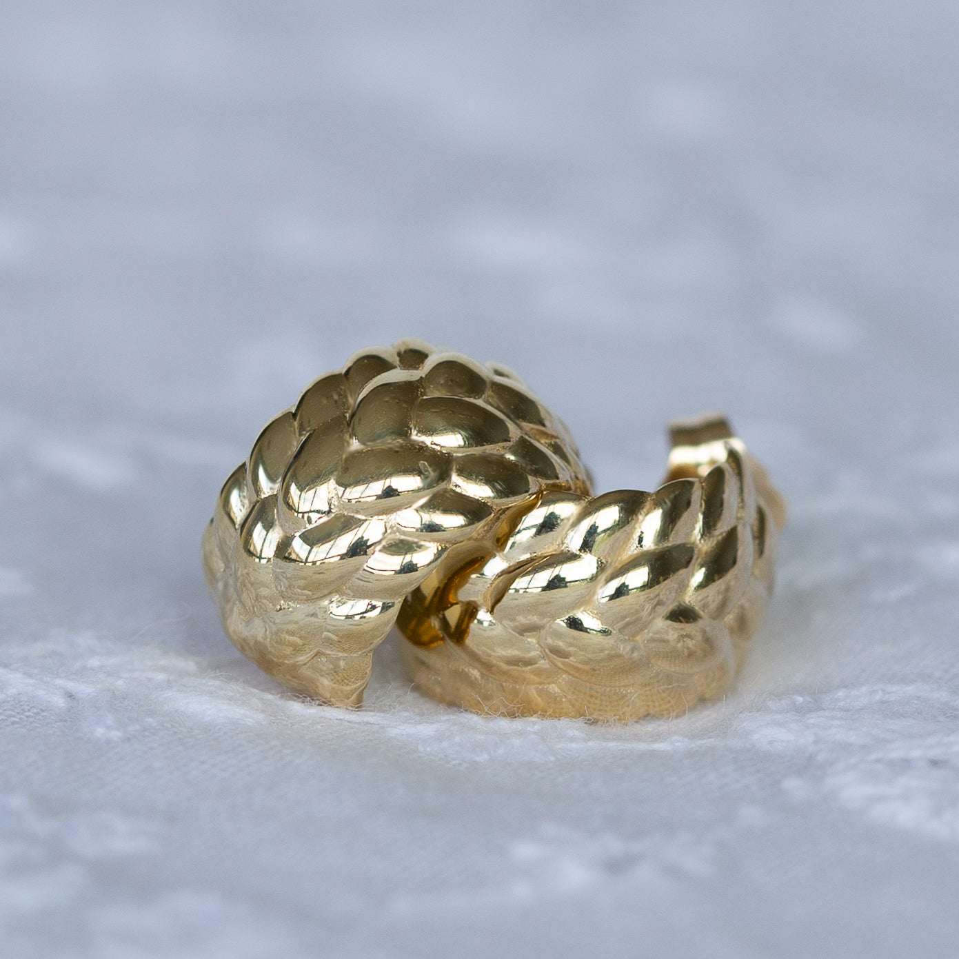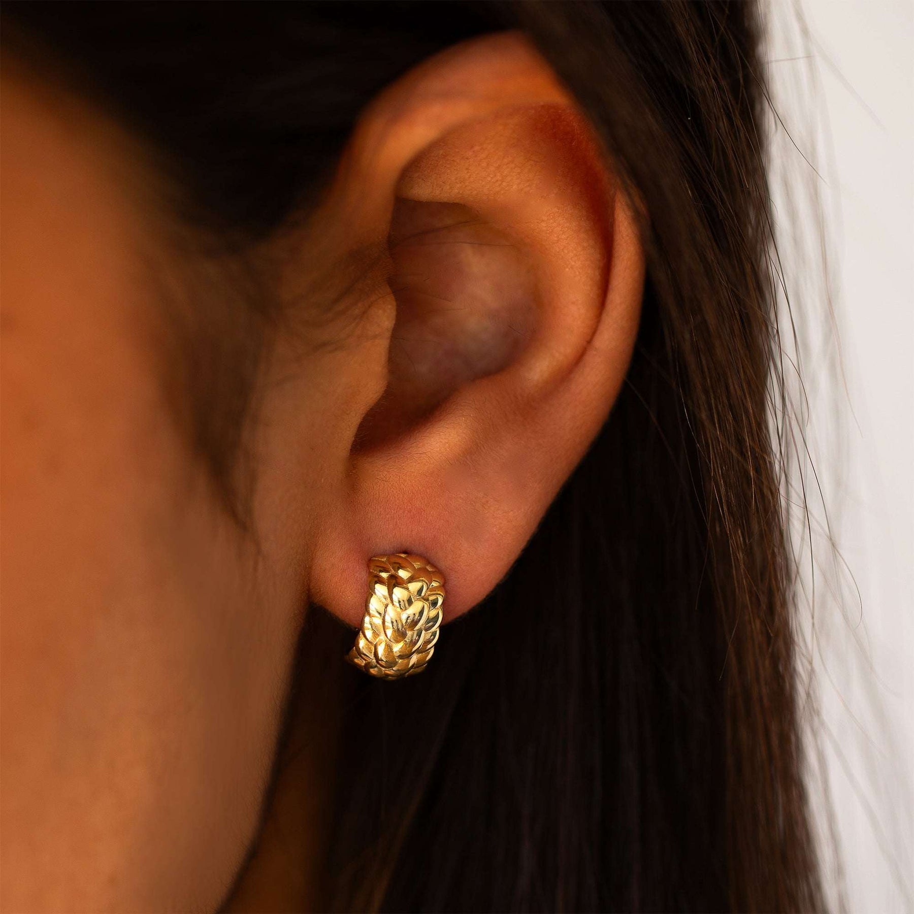 יש משהו בעיצוב של עגיל חישוק זהב קלוע שמרגיש נצחי. הפיתולים העדינים יוצרים משחק של אור וצל ומעניקים לעגיל עומק ומרקם ייחודי. הוא עשוי בזהב מלא ומעוצב כך שיישב קרוב לאוזן, כ־עגיל חישוק צמוד לאוזן עם נוכחות מדויקת – לא גדולה מדי, לא קטנה מדי.