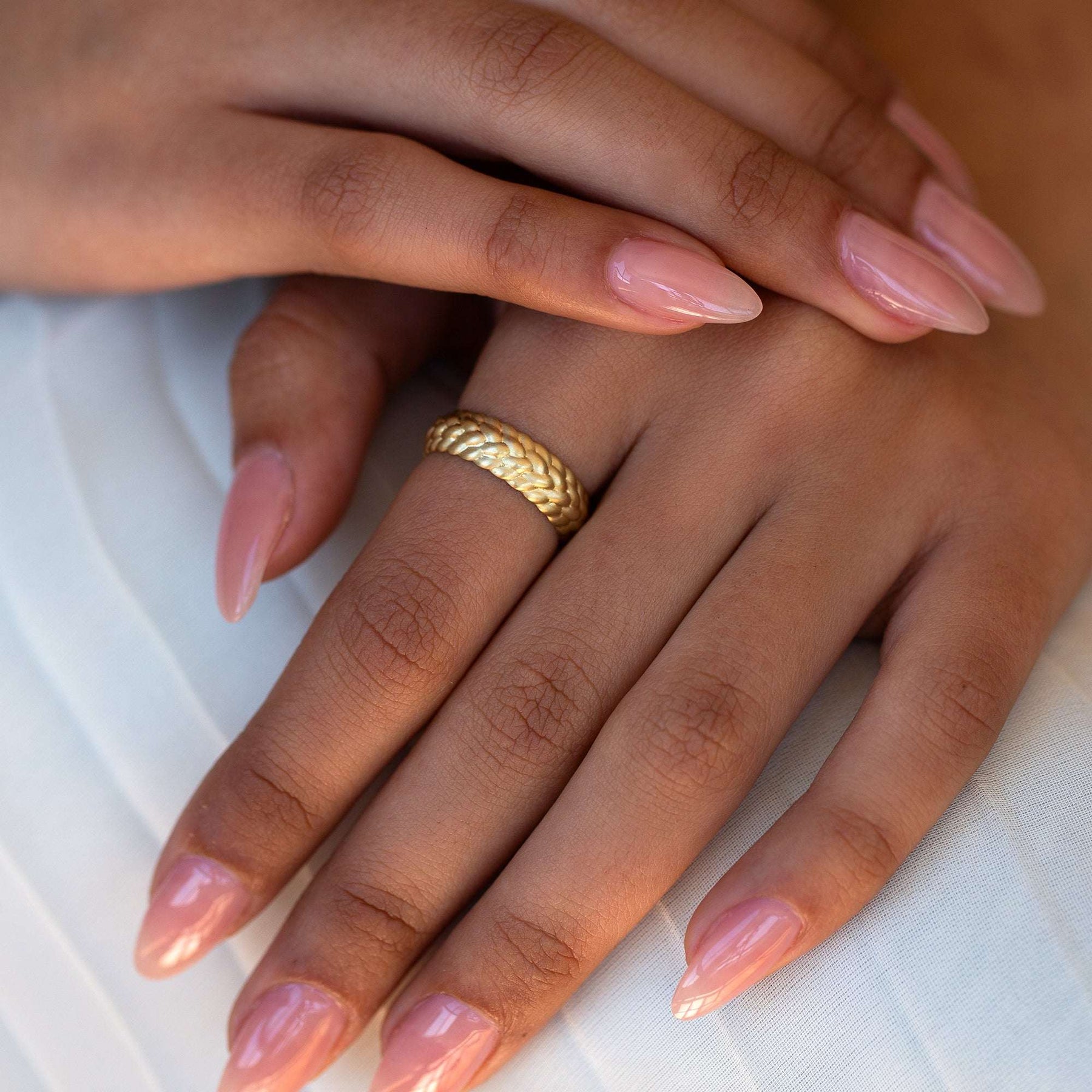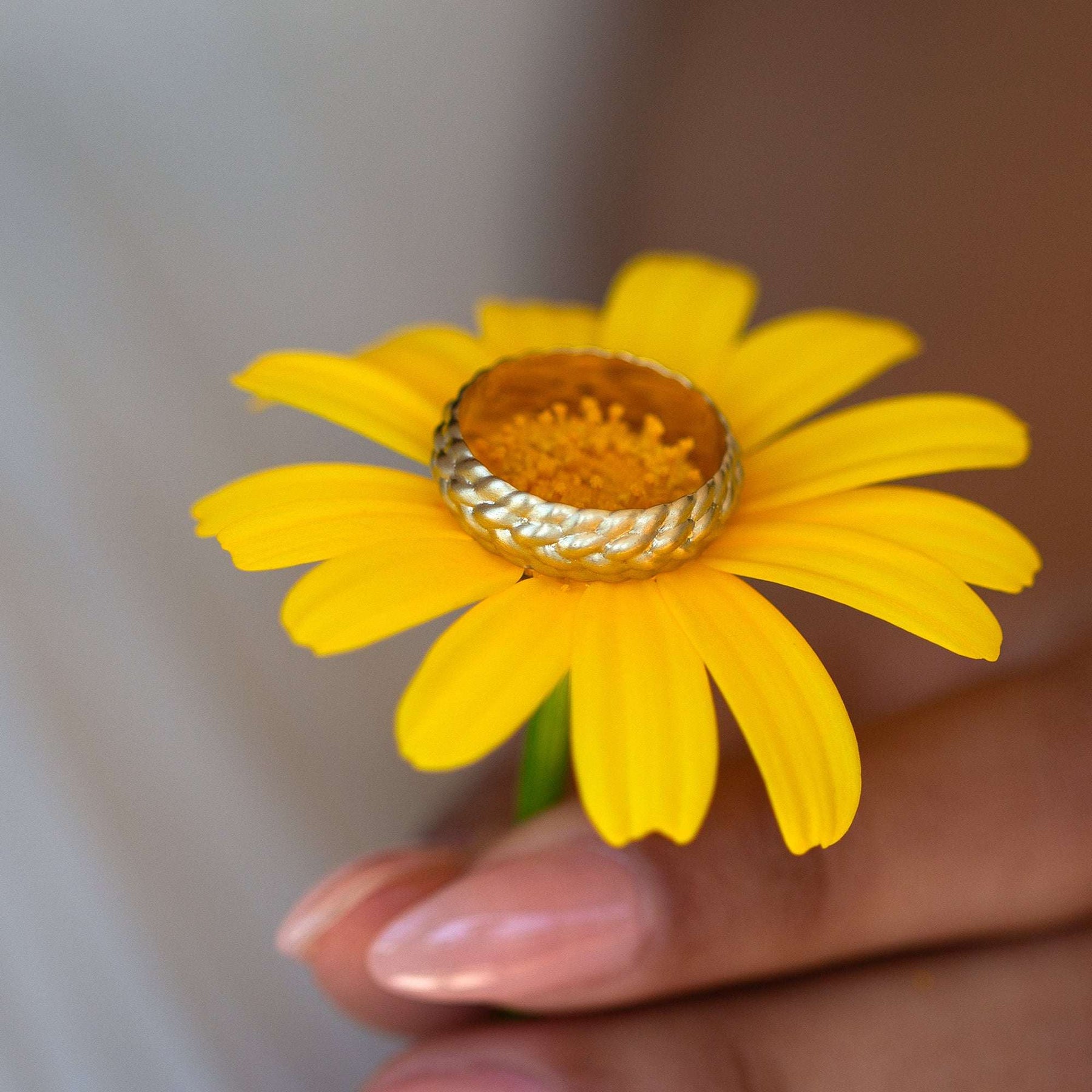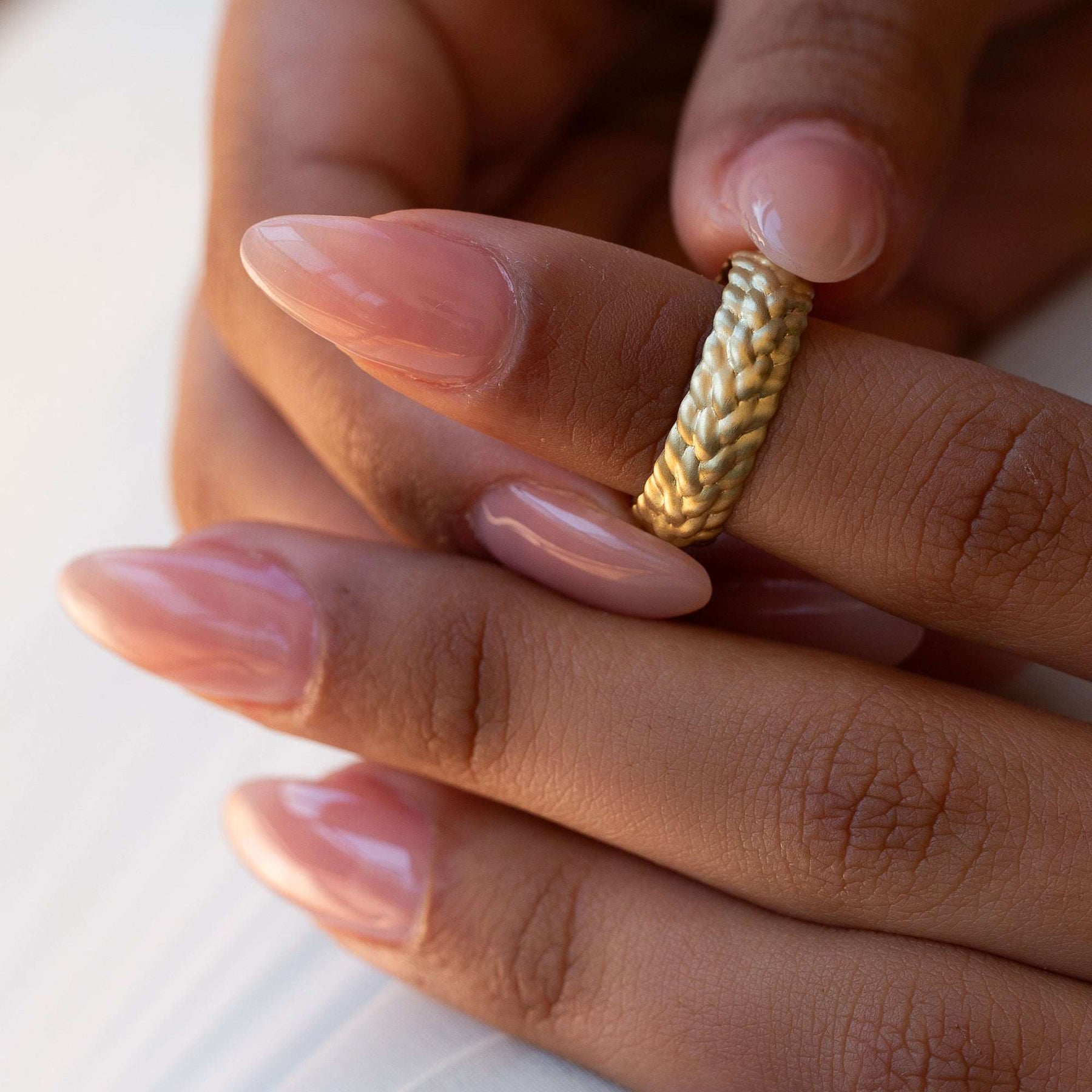 זהב ומסורת נקלעים יחד בטבעת המיוחדת הזו, בה אומנות עיצוב התכשיטים פוגשת את המלאכה העתיקה של קליעה. חוטי הזהב משתלבים בעדינות ויוצרים דוגמה מלאת משמעות, כמו צמת חלה מסורתית.