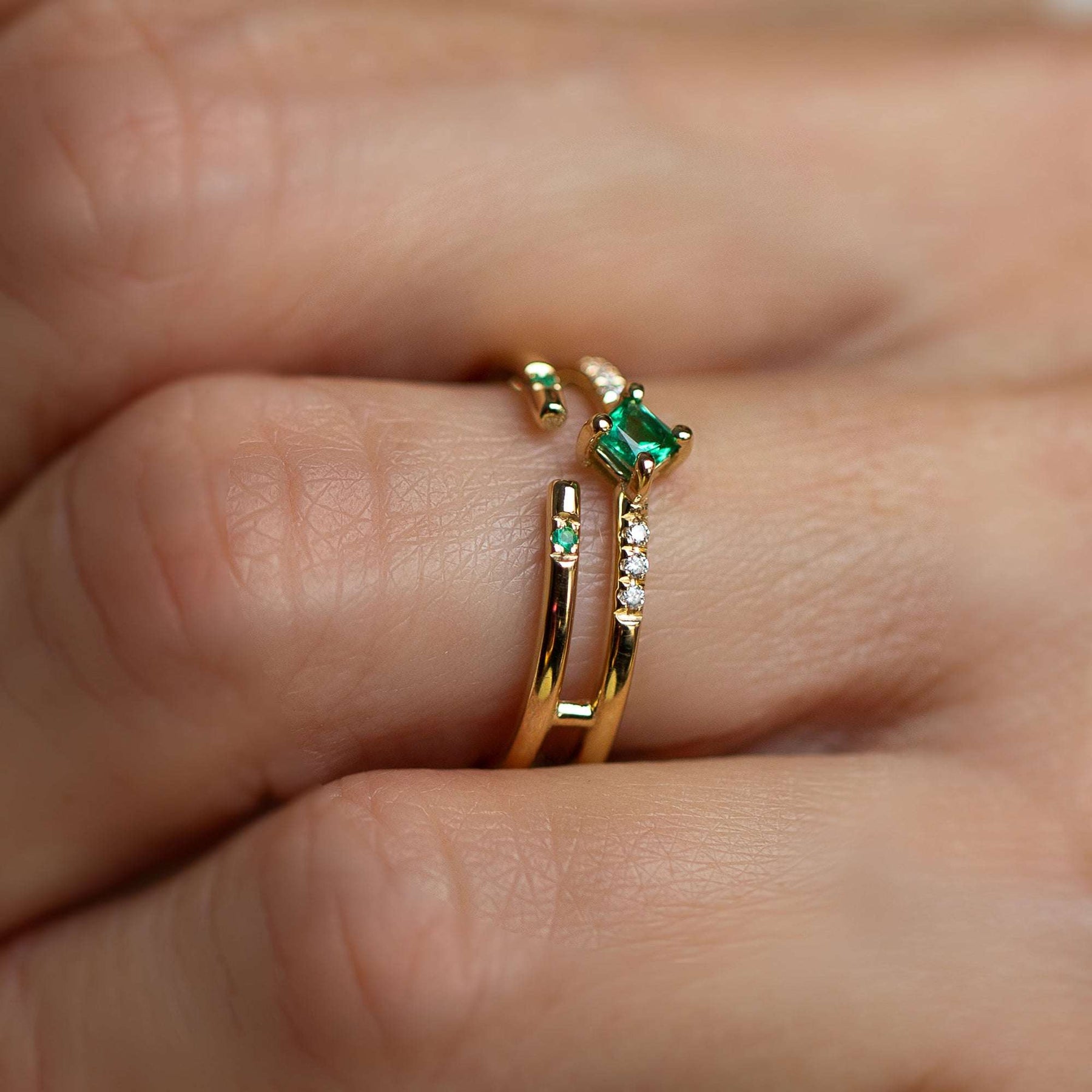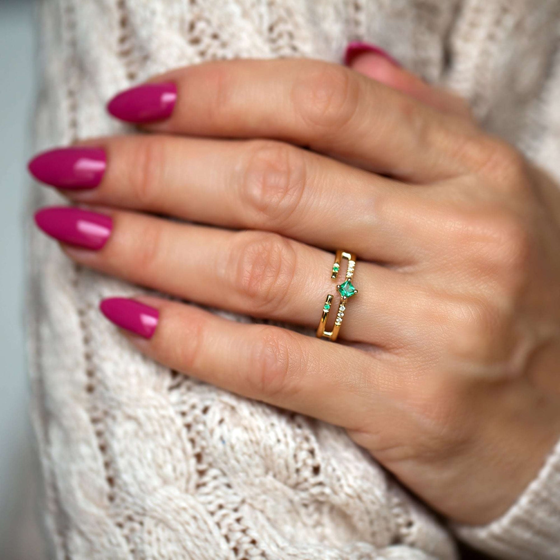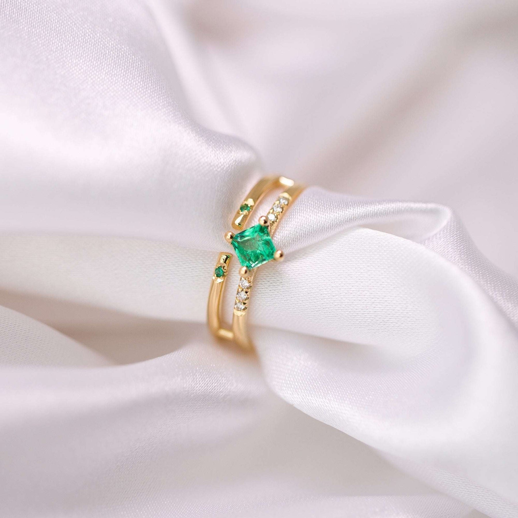 טבעת מינימליסטית ומודרנית, משובצת אבן אמרלד מרכזית בחיתוך פרינסס בגוון ירוק יפייפה ויהלומים לבנים איכותיים.